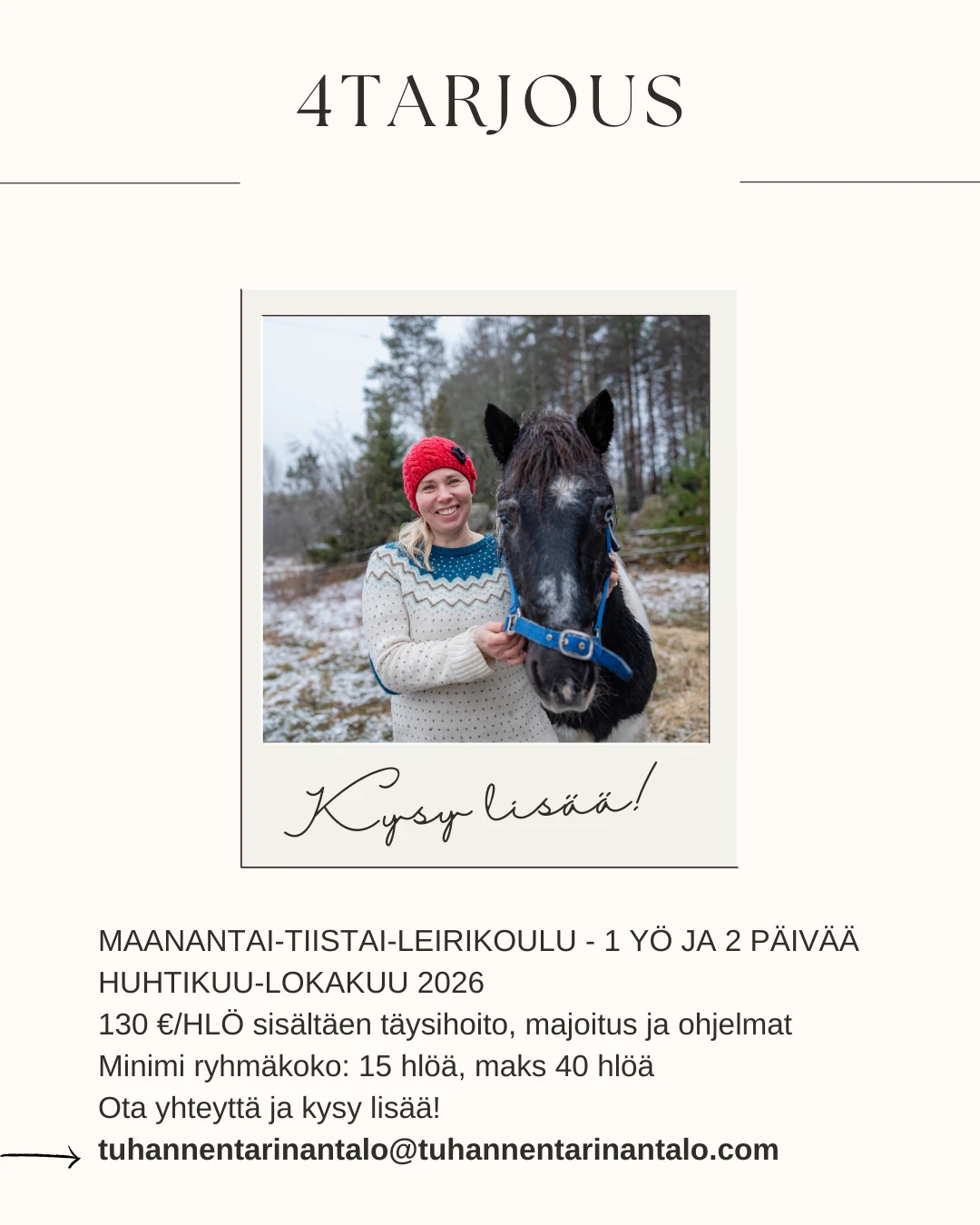 Keväällä huhti-toukokuulla ja syksyllä elo-lokakuussa 2026 on leirikouluille vielä tilaa alkuviikoista. Jos teillä on mietinnässä ikimuistoinen leirikoulu, joka ei kestoltaa rasita liiaksi opettajia eikä oppilaita, mutta kuitenkin tarjoaa monipuolisen kokemuksen maaseudun iloisten aktiviteettien parissa, kannattaa tutustua tähän pakettiin.