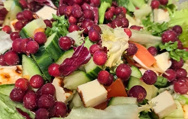Leipäjuusto-puolukka vihersalaatti